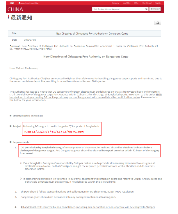 日前,HMM发布通告,由于堆场火灾和爆炸事故,吉大港港务局(CPA)宣布收紧港口和码头处理危险货物的安全规定。HMM决定立即停止接受至孟加拉国任何港口的危险品订舱,直至另行通知。在孟加拉港口卸货或转运的危险品类别包括:2.1/2.2/2.3/3/4.1/5.1/5.2/UNNO.2789。1、完成文件手续后,应在危险货物卸货前24小时取得孟加拉海关DG许可。危险品应在卸船后72小时内清关出港区。