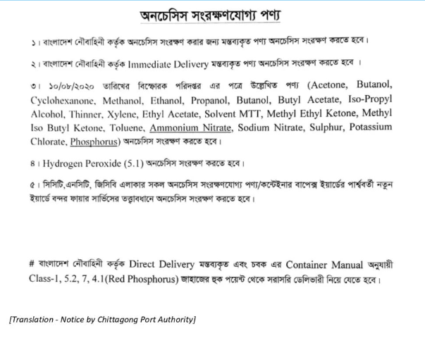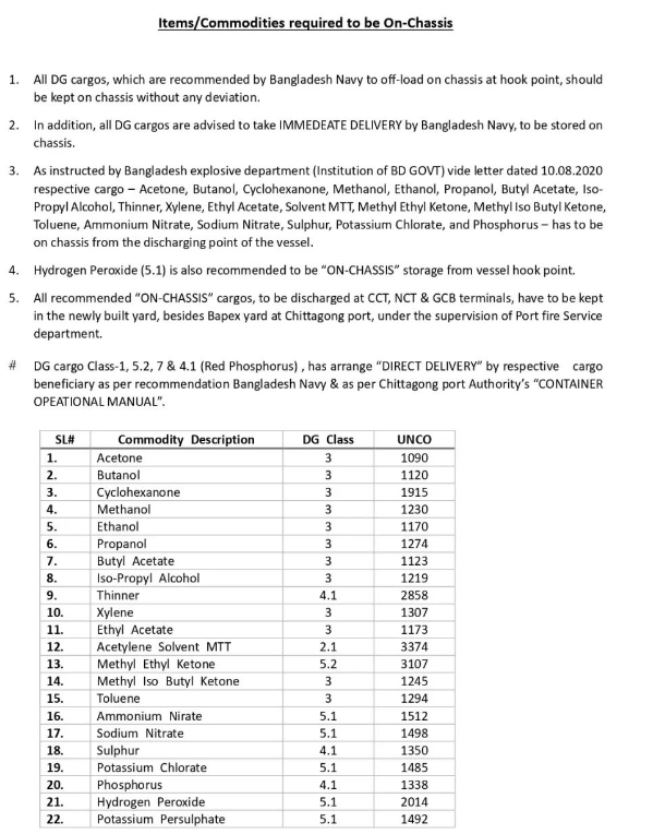 鉴于此次事故,吉大港港务局发布了港口新规,对涉及危险品货物要求提供对应的proper shipping name, IMCO, UN#,并显示在货描的前五行。吉大港港务局已向港口用户发布了多条指令,其中包括在抵达后3天内提离危险品集装箱/货物。吉大港港务局与进出口商、船务代理、清关行和货运代理公司等举行会议宣布对危险品货物的主要如下规定:并要求进口商在货物抵港前24小时与孟加拉国海关确认清关。