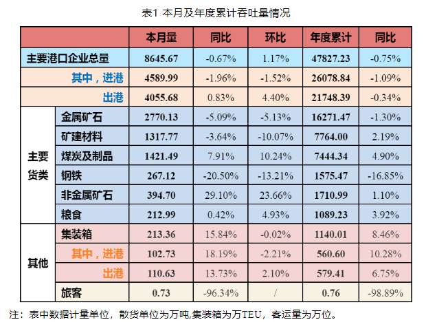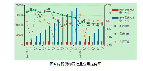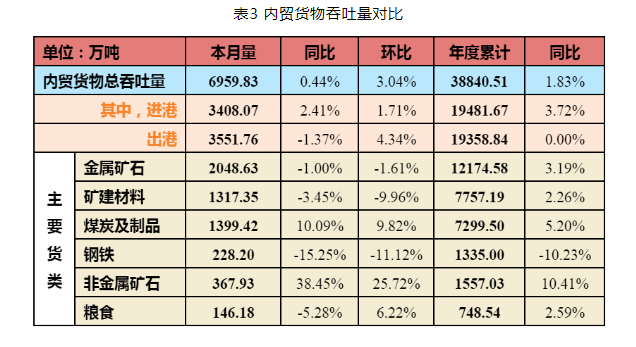 本年度累计方面,1-6月,主要港口企业完成内贸货物吞吐量38840.51万吨,同比增长1.83%,其中,内贸集装箱吞吐量完成631.25万TEU,同比增长4.94%。主要货类同比变化情况:金属矿石、非金属矿石进港量同比分别增长13.52%、35.50%,石油天然气及制品进港量同比下降27.68%;钢铁、非金属矿石出港量同比分别下降12.22%、10.15%。