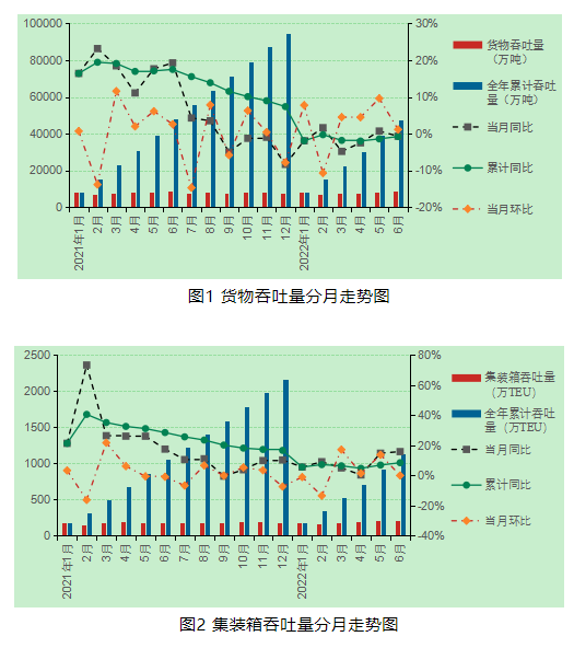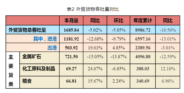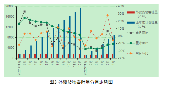 本年度累计方面,1-6月主要港口企业完成外贸货物吞吐量8986.72万吨,同比下降10.56%。外贸集装箱吞吐量完成508.76万TEU,同比增长13.16%;其中,出港266.77万TEU,进港241.99万TEU,同比分别增长9.84%和17.07%。主要货类同比变化方面,粮食进港量同比增长10.31%,金属矿石、木材、轻工医药产品、化工原料及制品进港量同比分别下降12.59%、19.53%、19.18%、21.16%。化工原料及制品、机械设备电器出港量同比分别增长51.25%、13.64%,化肥及农药、钢铁、非金属矿石出港量同比分别下降60.65%、12.77%、26.06%。