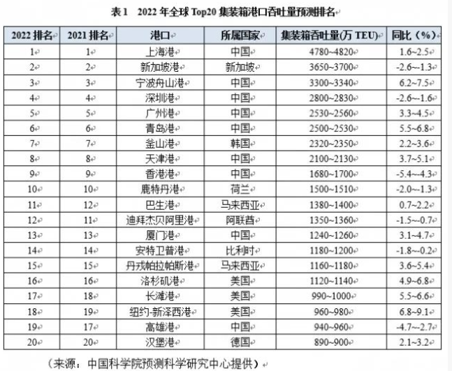 7月12日,中国科学院预测科学研究中心发布《2022年全球Top20集装箱港口预测报告》。报告显示,在全球前20大集装箱港口中,中国占了9个,且其中7个跻身前10。前10名港口排名顺序分别为:上海港、新加坡港、宁波舟山港、深圳港、广州港、青岛港、釜山港、天津港、香港港、鹿特丹港。另外厦门港排名第13,高雄港排名第19。