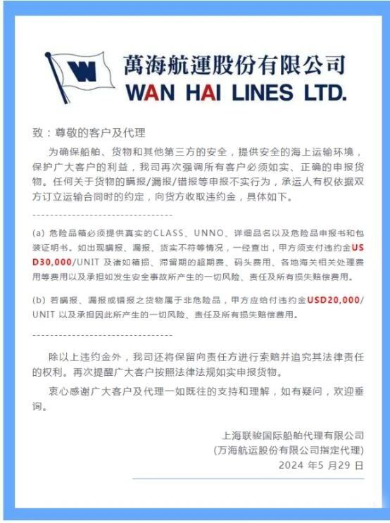 通知中万海重申:危险品如出现瞒报、漏报、货实不符等情况,一经查出,甲方须支付违约金USD30,000/UNIT 及诸如箱损、滞留期的超期费、码头费用、各地海关相关处理费用等费用以及承担如发生安全事故所产生的一切风险、责任及所有损失赔偿费用。