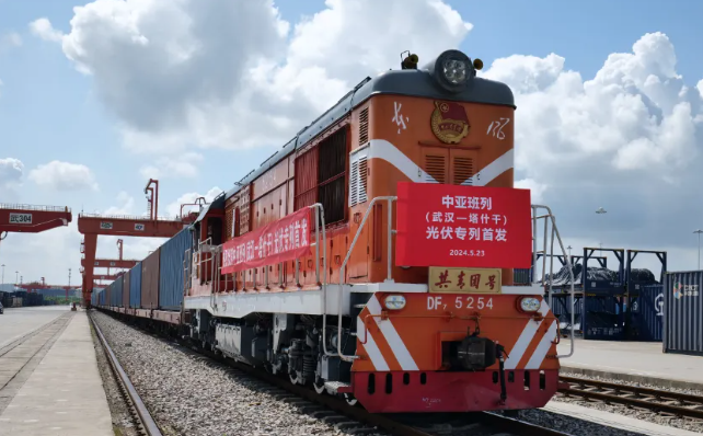 5月23日10时30分,首趟中亚班列(武汉—塔什干)光伏专列缓缓启动,一路向西开往乌兹别克斯坦首都塔什干。此次专列开行为高附加值、高科技产品出口中亚搭起一条高效稳定的陆路物流通道,助力湖北加快建设国内国际双循环重要枢纽。