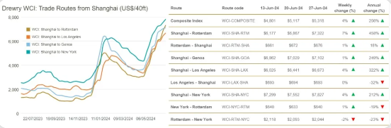 上海至鹿特丹的运费上涨455美元即7%至7322美元/FEU。上海至洛杉矶和上海至纽约的运费分别上涨4%至6673美元/FEU和7827美元/FEU。上海至热那亚的运费上涨1%至7102美元/FEU。
