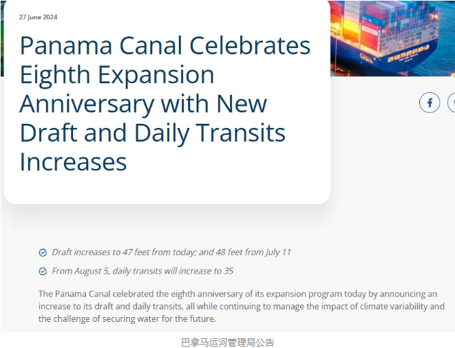 根据ACP的公告,自2024年8月5日起,新巴拿马船闸将增加1个新的预订时段,使巴拿马运河日船舶通行数量从目前的32艘增加至35艘,这意味着巴拿马运河的通航能力已基本恢复。