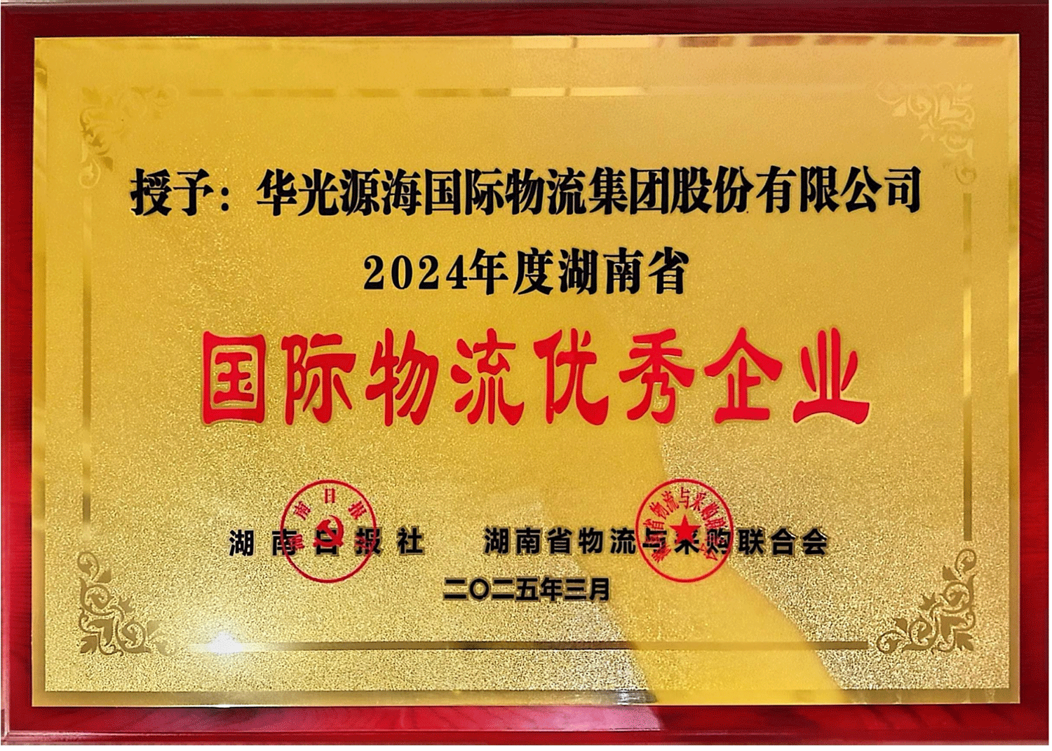 2025年3月31日,2024年度湖南省物流行业工作年会暨张家界市项目招商会在张家界碧桂园凤凰酒店盛大召开。华光源海国际物流集团股份有限公司在此次大会上凭借卓越的业务表现和行业影响力,荣获“2024年度湖南省水运物流优秀企业”和“2024年度湖南省国际物流优秀企业”称号,这两份荣誉不仅是对华光源海过去一年在水运物流领域及国际物流领域所做工作的高度认可,更是对其未来发展的巨大鼓舞。