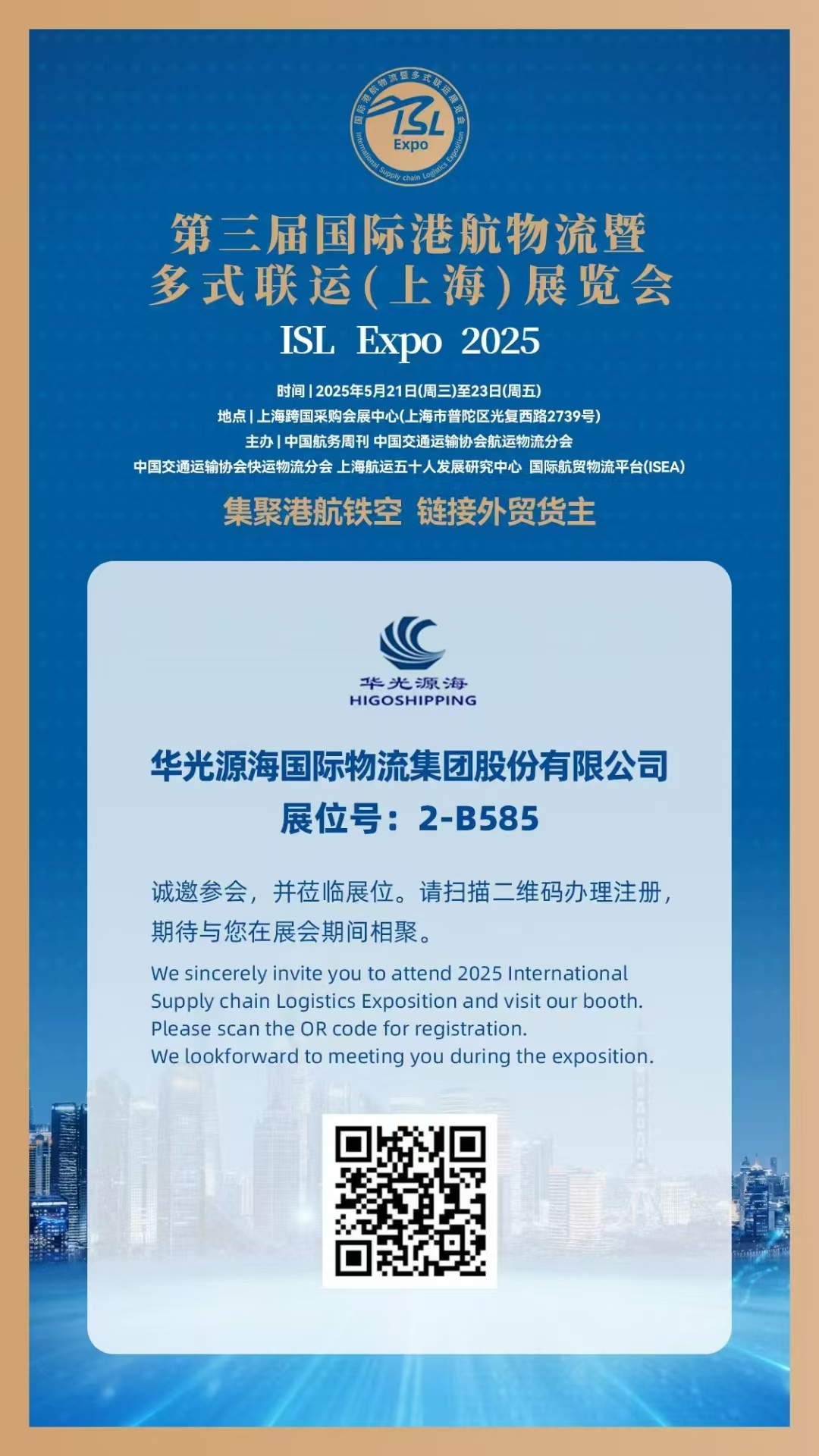 2025年5月21日-23日,“第三届国际港航物流暨多式联运(上海)展览会”(ISL Expo 2025),将在上海跨国采购会展中心举办,到场专业观众总数预计超过20000人,其中外贸货主买家超过2500人,将举行14场外贸货主同期活动和14场物流行业同期活动。作为北交所第一家国际物流上市企业,华光源海将出展此次展会,展位号为2-B585,诚邀您的莅临!