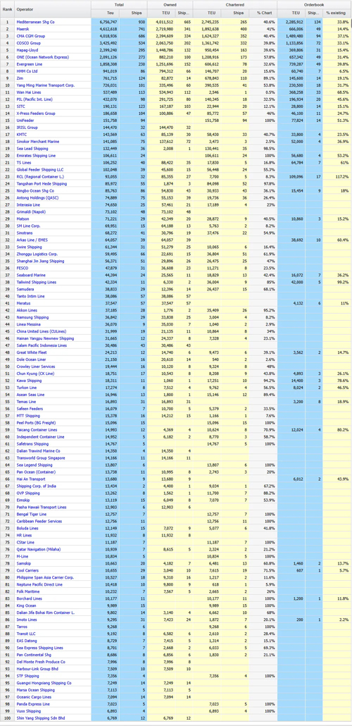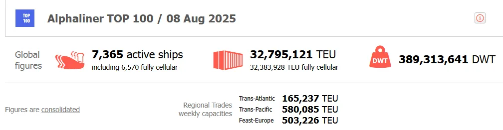 2025年8月8日,Alphaliner最新统计数据显示,全球共有7,365艘集装箱船舶,全球集装箱船队运力达到32,795,121TEU,合计船舶载重吨为389,313,641DWT (DEAD WEIGHT TONNAGE 缩写,载重吨)。