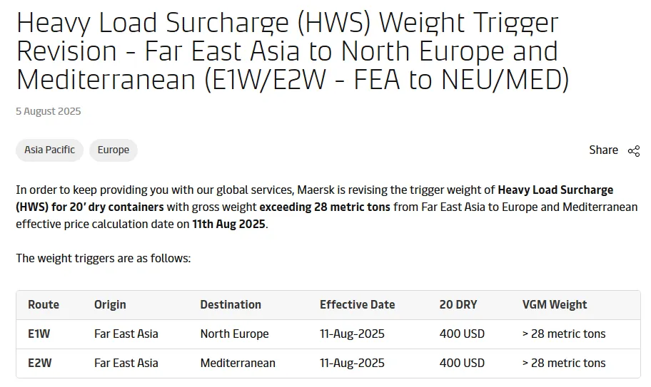 8月5日,马士基发布公告,调整远东-北欧和远东-地中海航线的超重附加费(HWS)重量触发标准。