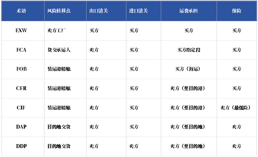 作为刚入行的货代从业者,准确理解国际贸易术语是开展业务的基础。以下是常见外贸术语(Incoterms® 2020)的简明解析,快速理解各术语的核心含义及风险划分: