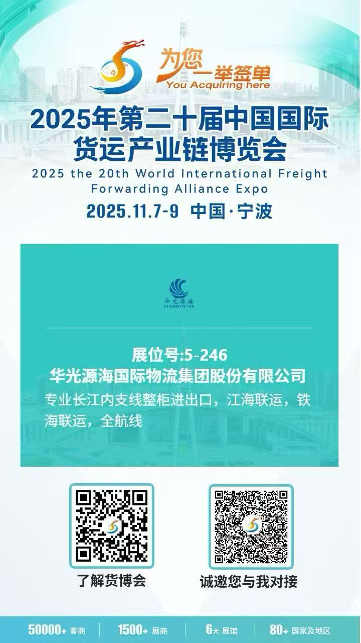 2025年11月7日至9日,第二十届中国国际货运产业链博览会(货博会)将于宁波盛大举行。华光源海国际物流集团股份有限公司将携优质业务与创新服务,隆重亮相5-246展位,开启一场精彩绝伦的行业盛宴,我们诚挚邀请海内外客户、合作伙伴及业界同仁莅临交流,共同探索货运行业发展的新机遇与新未来。