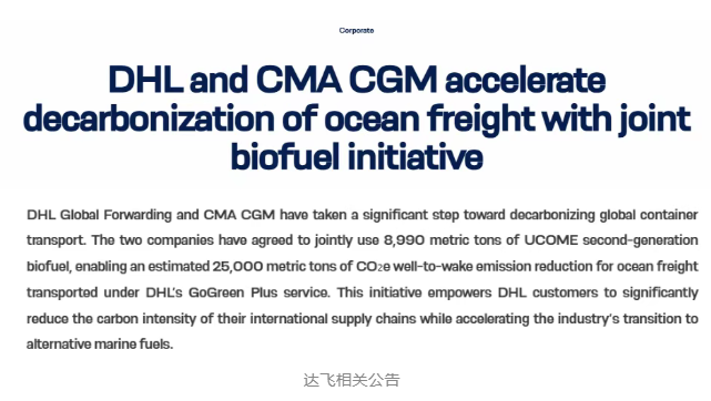 具体而言,双方将共同使用8990吨UCOME第二代生物燃料,并通过DHL的GoGreen Plus和达飞的ACT+低碳运输服务,帮助客户降低供应链碳强度,加速航运业向绿色燃料转型。