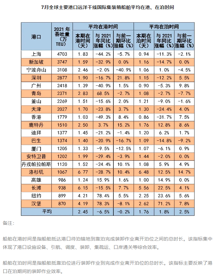 7月中国主要港口综合服务水平有所提升,美国主要港口船舶平均在港时间有所增加。