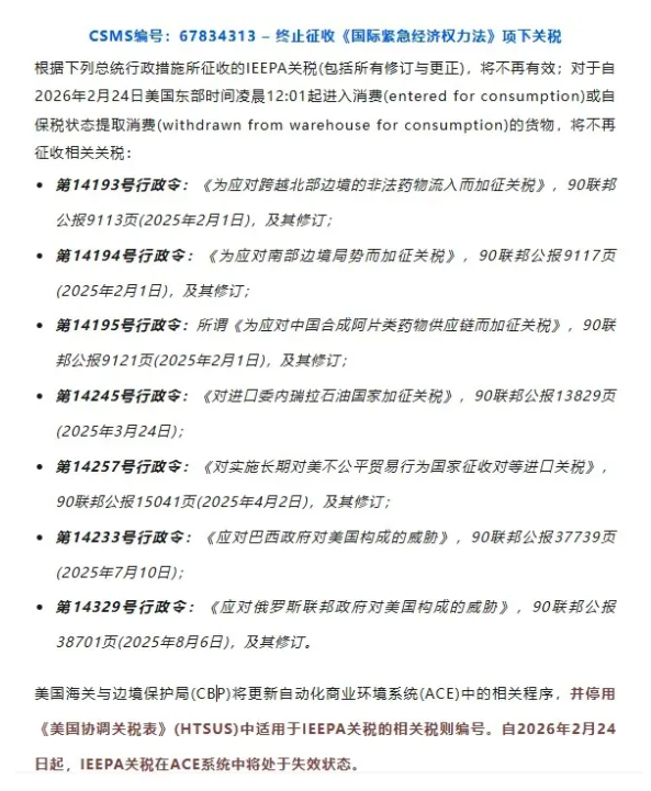 此次调整源于2026年2月20日发布的总统行政命令“Ending Certain Tariff Actions”。公告明确,自生效时间起,所有在IEEPA框架下实施的相关关税措施不再有效,不再对进入消费或自保税仓提取消费的进口货物征收额外关税。