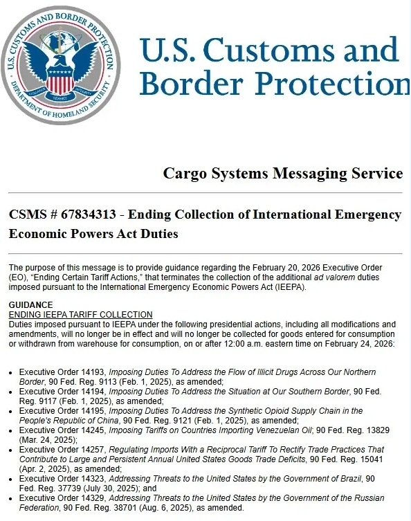 美国海关与边境保护局(CBP)日前通过货运系统消息(CSMS #67834313)发布公告,确认自2026年2月24日美国东部时间凌晨12:01起,正式终止依据《国际紧急经济权力法》(IEEPA)加征的所有额外关税。这意味着此前围绕“芬太尼关税”“对等关税”等一系列基于紧急经济权力实施的关税措施,将正式停止执行。
