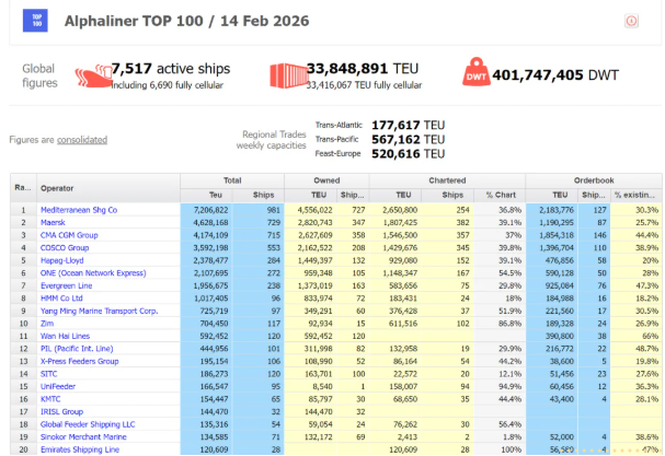 Alphaliner发布的数据显示,截至2026年2月14日,全球运营集装箱船总数为7,517艘,较一个月前(下同)增加15艘,全球运力共计33,848,891TEU,增加150,944TEU,运营船舶吨位共计401,747,405载重吨。