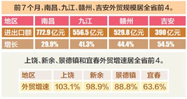 近日,小编从南昌海关获悉,据统计,今年前7个月,江西外贸总值3852.1亿元,进出口规模居全国第14位,中部第3位,同比(下同)增长45.2%。其中,出口2994.2亿元,增长54.6%;进口857.9亿元,增长19.9%。进出口、出口、进口增速均居中部第1,其中进出口增速全国第4,出口和进口增速全国第6,分别高出同期全国平均增速34.8个百分点、39.9个百分点和14.6个百分点。